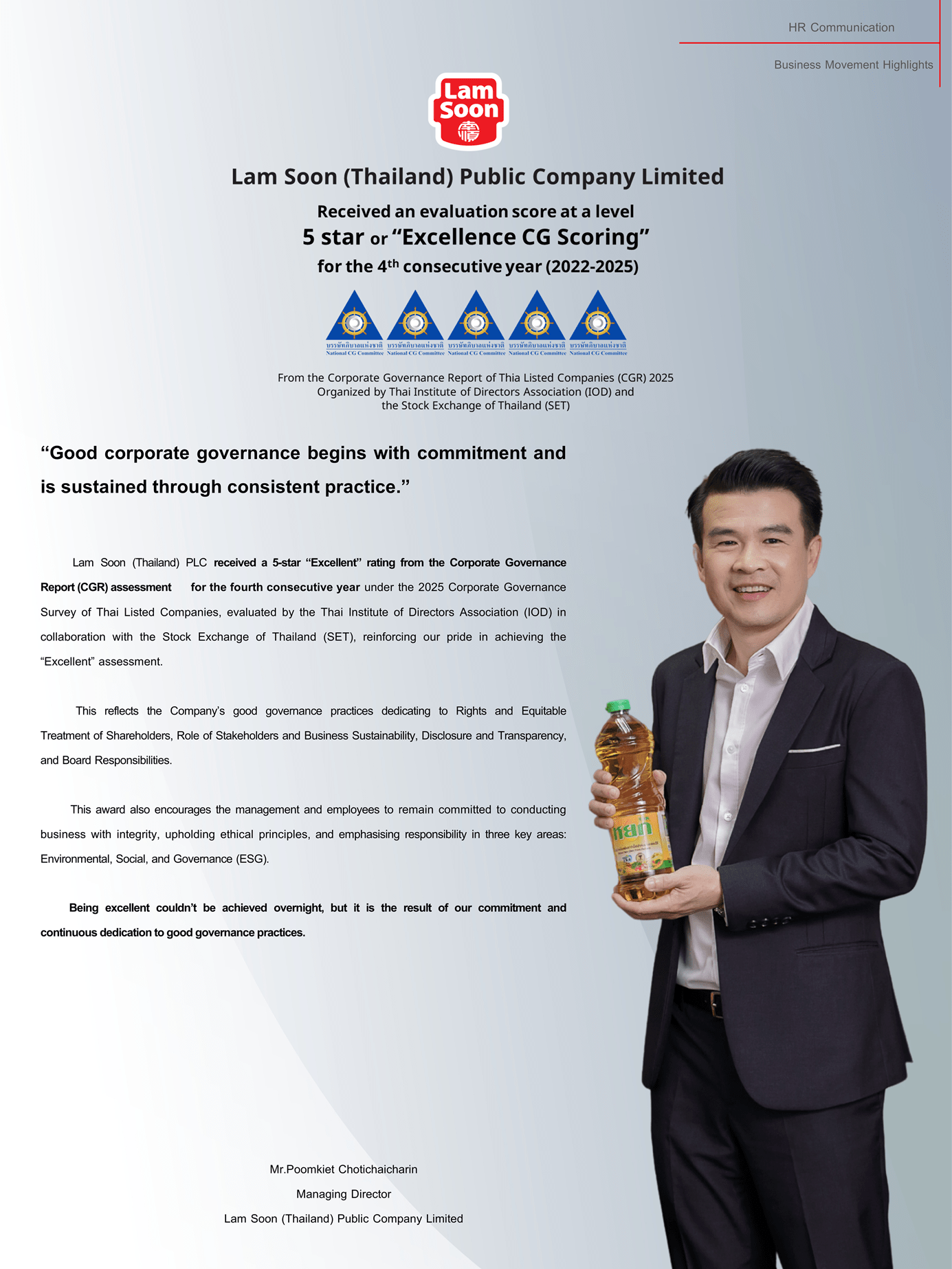 เมื่อวันที่ 28 ตุลาคม 2568 บริษัท ล่ำสูง (ประเทศไทย) จำกัด (มหาชน) ได้รับคะแนนการประเมินในระดับ 5 ดาว “ดีเลิศ” (Excellent CG Scoring) จากโครงการสำรวจการกำกับดูแลกิจการของบริษัทจดทะเบียนไทย (Corporate Governance Report of Thai Listed Companies 2025:CGR) ของสมาคมส่งเสริมสถาบันกรรมการบริษัทไทย (Thai Institute of Directors : IOD) สะท้อนให้เห็นถึงการบริหารงานตามหลักบรรษัทภิบาล โดยให้ความสำคัญกับสิทธิและการปฏิบัติต่อผู้ถือหุ้นอย่างเท่าเทียม มีความรับผิดชอบต่อผู้มีส่วนได้เสียและการพัฒนาธุรกิจเพื่อความยั่งยืน การเปิดเผยข้อมูลและความโปร่งใส และความรับผิดชอบของคณะกรรมการ การได้รับระดับคะแนนการประเมินดังกล่าวส่งเสริมให้ผู้บริหารและพนักงานของบริษัทมุ่งมั่นที่จะดำเนินธุรกิจอย่างซื่อสัตย์สุจริต มีหลักจริยธรรม และให้ความสำคัญกับการทำธุรกิจที่คำนึงถึงความรับผิดชอบ 3 ด้านหลัก คือ สิ่งแวดล้อม สังคม และการกำกับดูแล (ESG). Share กลับ